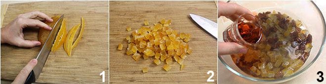 Para preparar o stollen, comece cortando a laranja cristalizada em fatias e reduzindo-a a cubos (1-2). Coloque-a de molho junto com as passas em uma tigela com água morna, de modo que tudo fique coberto e com 50 ml de rum retirados da dose total 3.