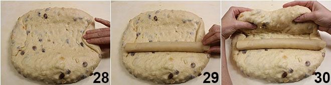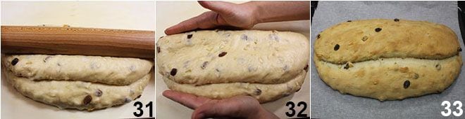 pressione com o rolo de massa no centro, para selar bem e conferir a forma clássica ao stollen 31. Modele um pouco com as mãos para dar ao stollen uma forma regular 32 e coloque-o em uma assadeira forrada com papel manteiga. Asse em forno estático pré-aquecido a 180° por cerca de 60-70 minutos, até que o stollen esteja dourado 33.