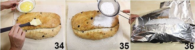 Assim que for retirado do forno, pincele imediatamente com manteiga derretida 34 e polvilhe com bastante açúcar de confeiteiro peneirado 35, depois deixe esfriar sobre uma grade. Embrulhe-o então em papel alumínio e deixe descansar o stollen em um local fresco (mas não na geladeira) por alguns dias antes de consumi-lo, para que absorva umidade e atinja a consistência clássica. Feliz Stollen e Feliz Natal a todos!!