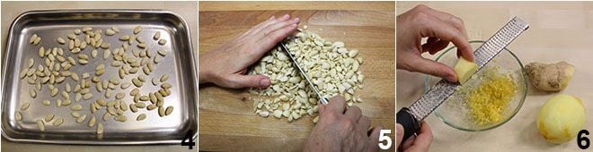 Enquanto isso, disponha as amêndoas sem pele em uma assadeira e torre-as no forno, até que fiquem crocantes, mas não muito coloridas 4. Se tiver amêndoas com pele, escalde-as por 5 minutos em água fervente e depois retire a pele, que sairá facilmente. Quando as amêndoas estiverem frias, pique-as grosseiramente 5 e reserve. Rale a casca do limão e o gengibre em uma tigela e reserve 6.
