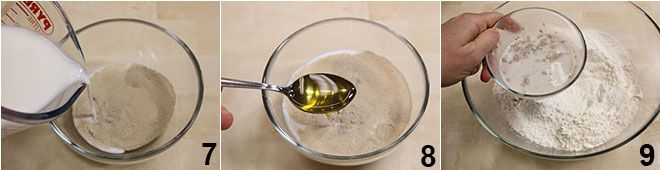 Dissolva o fermento (você pode usar também um cubo de fermento biológico fresco esfarelado) em um pouco de leite morno (retirado da dose total da receita) e adicione uma colher de chá de mel (7-8). Coloque a farinha em uma tigela e faça um buraco no centro, onde você despejará o fermento 9.