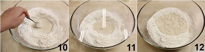 Misture com uma colher, incorporando ao fermento um pouco de farinha, até obter uma mistura semelhante a uma massa líquida, que você deixará assim no centro sem misturar 10. Cubra tudo com filme plástico 11 e deixe fermentar por pelo menos meia hora em um local morno, até que a mistura dobre de volume 12.