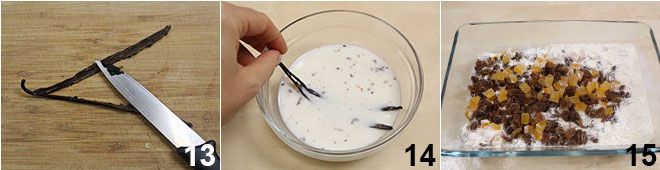 Enquanto a massa fermenta, corte uma fava de baunilha ao meio e raspe suas sementes internas com a lâmina de uma faca pequena 13. Coloque a fava aberta e as sementes em infusão, dentro de uma tigela contendo o restante do leite que você aqueceu 14. Em seguida, derreta a manteiga e deixe esfriar; finalmente, escorra as passas e a laranja cristalizada, seque com papel toalha, passe na farinha 15 e depois em uma peneira para remover o excesso.