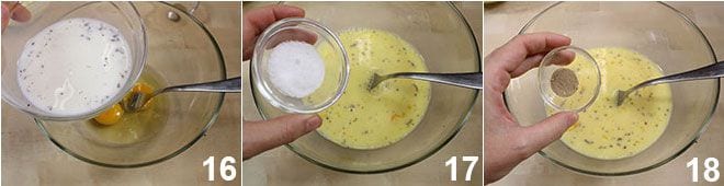 Neste ponto, em uma tigela, bata os dois ovos e adicione o leite no qual você havia colocado a baunilha em infusão (eliminando previamente a fava) 16. Adicione o sal e o cardamomo 18 e por fim