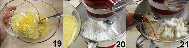 a casca de limão e o gengibre ralados 19. Despeje a mistura de fermento e farinha na tigela de uma batedeira (ou em uma tigela grande, se amassar à mão) e ligue a máquina com a pá (velocidade baixa). Despeje dentro da tigela a mistura de ovos e leite 20, em seguida, mais 50 ml de rum 21 e o açúcar.