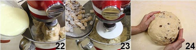 Por último, adicione a manteiga derretida morna aos poucos 22. Assim que os ingredientes estiverem incorporados, retire a pá e coloque o gancho, depois amasse por cerca de 10 minutos até que a massa esteja homogênea e completamente aderida ao gancho. Adicione as amêndoas picadas (frias) e depois as passas e a laranja cristalizada enfarinhadas 23 e amasse por mais alguns minutos. Coloque a massa em uma superfície de trabalho, dê uma forma redonda 24.