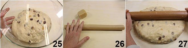 Em seguida, coloque-a em uma tigela grande, cubra com filme plástico e deixe fermentar por uma hora em um local morno 25. Enquanto isso, pegue o marzipã e dê-lhe uma forma cilíndrica 26. Após o tempo de fermentação, coloque a massa sobre uma superfície de trabalho, dê-lhe uma forma retangular e com o rolo de massa, pressione no centro, alongando um pouco a massa para obter nos lados mais longos um inchaço mais espesso que o outro 27.