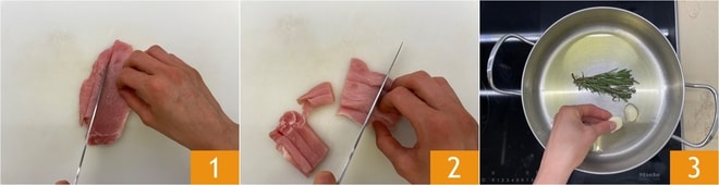 Para preparar os bifinhos de porco à cerveja. Como primeiro passo, corte o lombo em fatias, depois corte em tiras 1 e continue para obter os bifinhos 2. Em uma panela, coloque o azeite de oliva extra virgem, o alecrim e o alho 3. Deixe perfumar em fogo baixo.