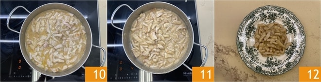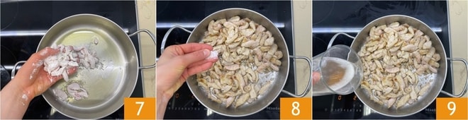 Elimine o excesso de farinha dos bifinhos e transfira-os para a panela 7. Salgue 8, doure bem e regue com a cerveja 9.