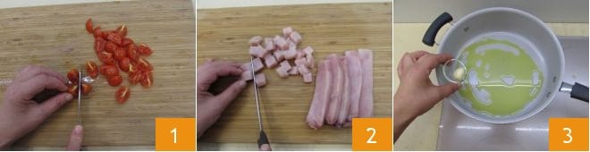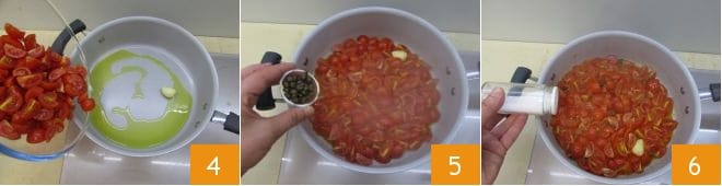 Adicione os tomatinhos 4 e as alcaparras dessalinizadas 5, depois ajuste o sal 6 e a pimenta. Deixe cozinhar assim por cerca de 10 minutos em fogo baixo.