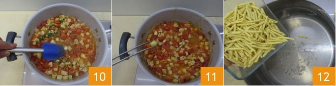 Misture os ingredientes para integrar os sabores 10. Depois, retire o alho 11 e desligue o fogo. Enquanto isso, cozinhe a massa em abundante água fervente, salgada a gosto 12.