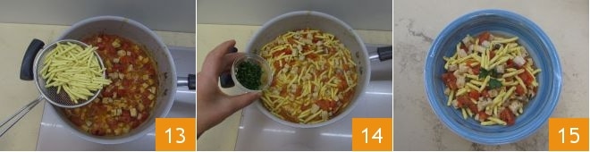 Quando estiver cozida, escorra e coloque diretamente na panela com o molho de peixe e tomatinhos 13. Polvilhe com a salsinha restante (sempre picada finamente) 14 e misture os ingredientes, depois sirva seus strozzapreti com espadarte, tomatinhos e alcaparras 15 e sirva ainda quente.