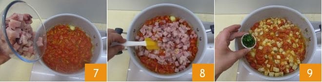Agora, adicione também o peixe-espada 7 e misture os ingredientes 8 para promover um cozimento uniforme. Deixe cozinhar em fogo baixo por mais 5 minutos. Adicione agora metade da quantidade de salsinha picada finamente 9.