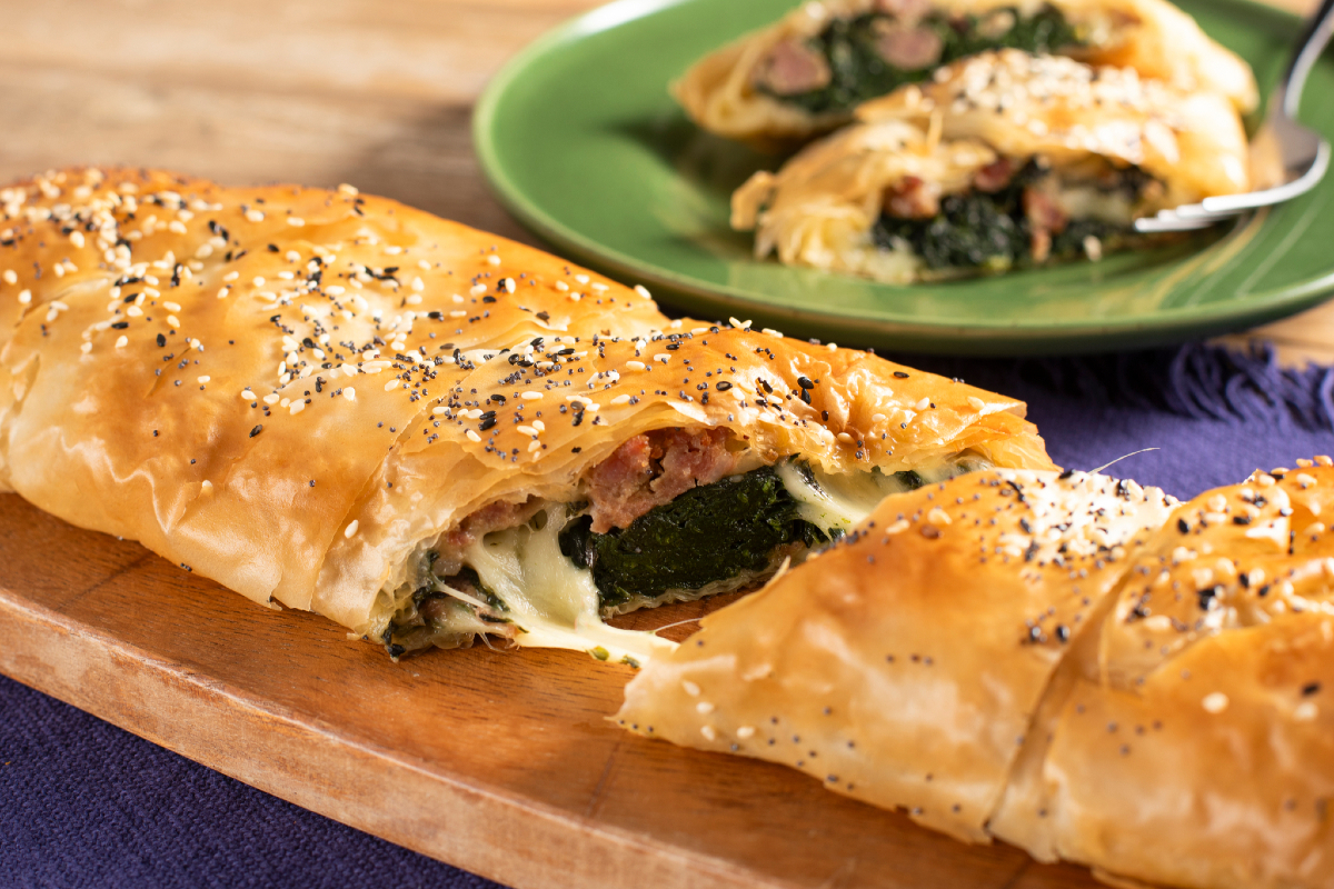 Strudel de massa filo com linguiça e espinafre