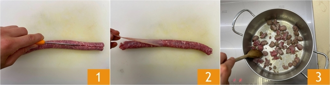 Para preparar o strudel de massa filo com linguiça e espinafre, primeiro corte a linguiça no sentido do comprimento 1 e remova a tripa 1. Em uma panela, aqueça um fio de óleo e adicione a linguiça esfarelada 3.