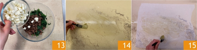 Complete o recheio com os cubos de queijo 13 e misture. Pincele com óleo a superfície de trabalho 14, depois estenda uma folha de papel manteiga de modo que fique bem aderida. Pincele também a folha de papel manteiga 15.