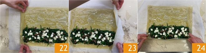 Dobre a aba lateral sobre si mesma e pressione bem para selar 22, depois faça o mesmo do outro lado 23. Agora levante o lado longo, pelo lado do recheio 24.