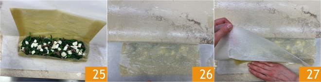 Prossiga assim com todas as 6 folhas de massa filo. Pincele a última camada com óleo 19 e recheie a metade inferior com o recheio, tomando cuidado para deixar uma borda livre 20. Agora feche a massa: levante o papel manteiga para dobrar levemente o lado curto 21.