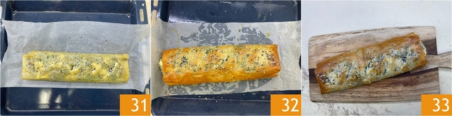 Transfira o strudel para uma assadeira, com a parte da união virada para baixo 31. Asse em forno fixo pré-aquecido a 200° por 20 minutos. Retire do forno 32 e deixe amornar. O strudel de massa filo com linguiça e espinafre está pronto para ser saboreado 33!