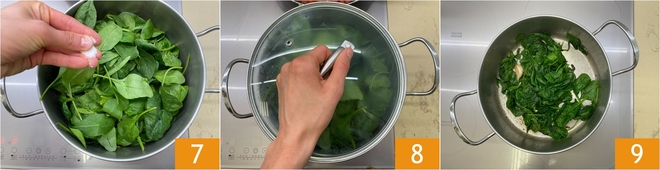 Tempere com sal 7, cubra com a tampa 8 e continue cozinhando por cerca de 3 minutos em fogo médio, ou até que o espinafre esteja macio. Nesse ponto, retire a tampa e cozinhe por mais um minuto para deixá-los mais secos 9.