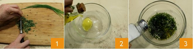 Para preparar a travessa de cogumelos saborosos, comece picando as ervas que servirão para temperá-los: pique a salsa 1, a cebolinha, o orégano, o dente de alho. Depois, em uma tigelinha, despeje um fio de azeite 2, adicione o picado de ervas aromáticas e salgue 3 e tempere com pimenta a gosto.