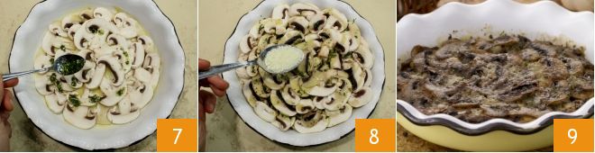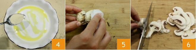 Unte uma travessa de 25 cm de diâmetro com um fio de azeite e polvilhe com o pão ralado. Depois, passe para a limpeza dos cogumelos champignon (você também pode consultar a Escola de Cozinha: limpeza dos cogumelos champignon). Corte as raízes dos cogumelos, depois esfregue com um pano limpo para remover a terra; em seguida, corte-os em fatias bem finas 6.