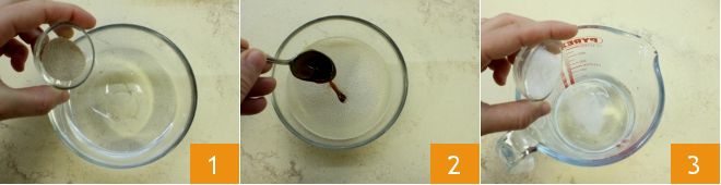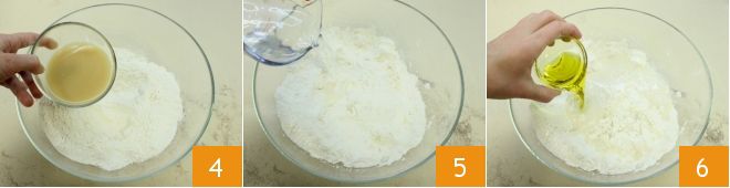 Em seguida, adicione o fermento e o malte dissolvidos em água na tigela com a farinha 4, depois despeje também a água em que dissolveu o sal 5. Por último, adicione o azeite de oliva 6.