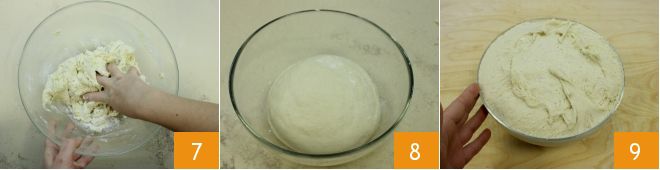 Depois, comece a sovar a massa na tigela 7, transfira a massa para uma superfície enfarinhada e trabalhe a massa até que fique homogênea e elástica. Em seguida, coloque-a em uma tigela 8 e cubra com um filme plástico adequado para micro-ondas, depois coloque a tigela no micro-ondas Smart Oven Samsung e configure o programa de fermentação automática 1-3 (peso máximo de 900 g). A massa dobrará de volume 9.