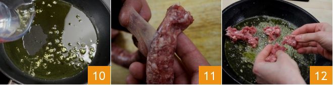 Enquanto a massa fermenta, prepare o recheio: em uma frigideira grande, refogue o alho picado com o azeite 10. Enquanto isso, retire a pele da linguiça 11, depois coloque a carne picada na frigideira 12 e cozinhe adicionando o funcho selvagem e regando com o vinho tinto. Salgue, tempere com pimenta a gosto e cozinhe por cerca de 10 minutos.