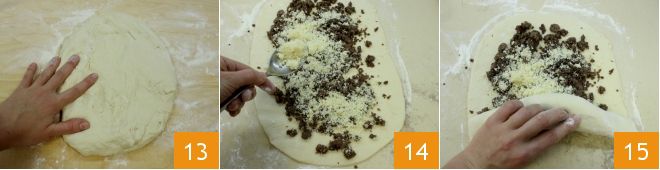 Quando o programa de fermentação terminar, retire a massa e estenda-a em uma superfície de trabalho enfarinhada 13, dando-lhe uma forma oval; depois despeje sobre o ragu de linguiça branco, deixando alguns centímetros da borda e polvilhe com o queijo ralado 14. Comece a enrolar o strudel pelo lado menor 15.