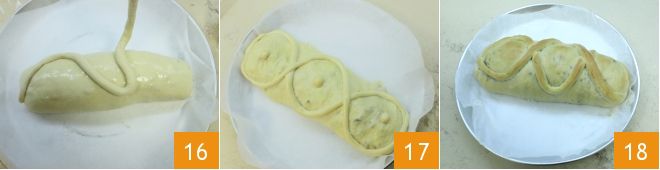 Quando terminar, corte as extremidades e sele bem o strudel; com as extremidades eliminadas, crie pequenos pães para decorar o strudel de pão (16-17). Neste ponto, coloque no micro-ondas configurando o programa de cozimento por convecção como se fosse um forno normal: asse a 180° graus por cerca de 30 minutos. Depois retire o strudel 18 e corte em fatias para servir!