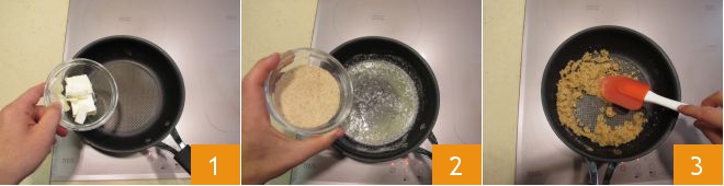 Para preparar o strudel de pêras e chocolate, comece colocando a manteiga em uma frigideira pequena 1. Deixe-a derreter e, em seguida, adicione a farinha de rosca 2 e deixe dourar por alguns minutos, mexendo sempre. Assim que estiver pronta, reserve em uma tigelinha 3<\/p>