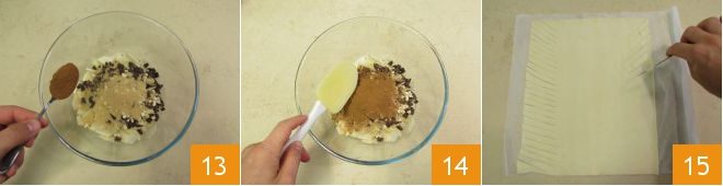 a canela 13. Misture tudo bem 14. Abra a massa folhada e imagine dividi-la em 3 partes no sentido do comprimento. Na parte central você deve colocar o recheio; nas faixas laterais faça cortes oblíquos a cada 1 cm 15.<\/p>