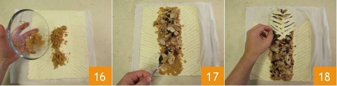Então cubra a parte central primeiro com as migalhas tostadas 16 e depois com o recheio de pêra e chocolate 17. Levante as tirinhas que você fez nas laterais, uma a uma, trazendo-as para o centro de forma alternada 18.<\/p>