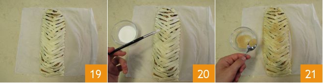 Dessa forma você terá um efeito em grade 19. Se sobrar alguma tira de massa, você pode descartá-la. Por fim, pincele as tirinhas com um pouco de creme de leite 20 e polvilhe com açúcar mascavo 21.<\/p>
