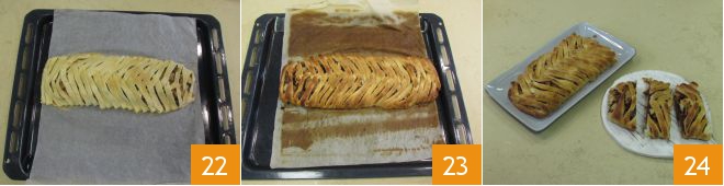 Asse em forno tradicional, já pré-aquecido a 200, por cerca de 20 minutos 22. Uma vez assado 23, deixe o strudel de pêras e chocolate esfriar completamente antes de cortá-lo e saboreá-lo 24.<\/p>