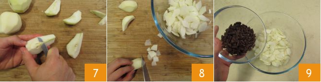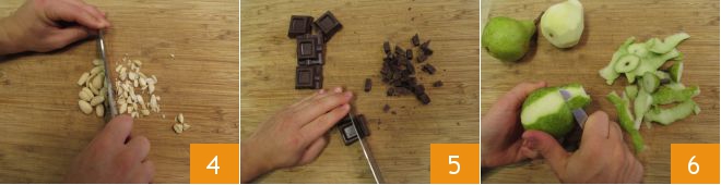 Pique tanto as amêndoas 4 quanto o chocolate 5 e reserve. Agora, prossiga com as pêras. Depois de descascá-las e remover as duas extremidades 6,<\/p>