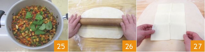 Por último, adicione o manjericão 25 e remova o alho, retire do fogo e deixe esfriar: é importante que o ragu esteja bem frio quando for usá-lo para rechear o strudel. Enquanto isso, pegue a massa do strudel e estenda-a sobre uma superfície levemente enfarinhada com um rolo 26, formando um quadrado de 38x38 cm. Coloque no centro da massa as fatias de queijo, deixando alguns centímetros da borda 27.