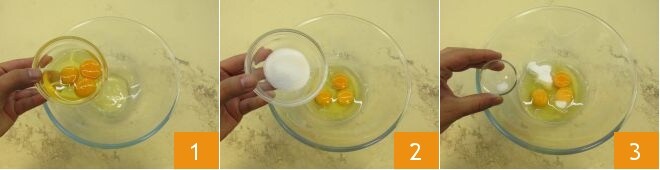 Para preparar os struffoli com frutas vermelhas, comece pela preparação da massa. Quebre os ovos em uma tigela grande 1, adicione o açúcar 2 e uma pitada de sal 3.
