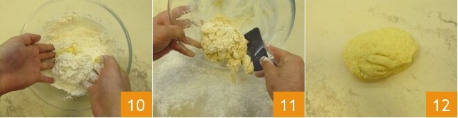 e comece a trabalhar a massa com as mãos, ainda dentro da tigela 10. Assim que ficar bastante compacta, transfira para uma superfície enfarinhada abundantemente 11 e continue o trabalho, amassando com as mãos com poucos movimentos apenas o tempo necessário para obter um resultado liso e homogêneo 12.