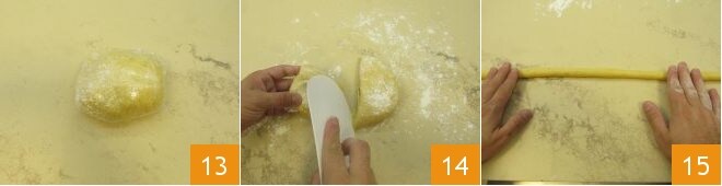 Neste ponto, envolva seu bloco de massa com filme plástico 13 e coloque na geladeira para descansar por uma hora. Após o tempo indicado, retire o bloco de massa e polvilhe-o com mais um pouco de farinha, apenas o suficiente para ajudar a trabalhar a massa 14. A partir disso, faça tiras grossas de cerca de 1 cm, esticando cada pedaço de massa 15 e batendo levemente na bancada pegando pelas extremidades, para tornar a massa mais elástica e alongá-la mais facilmente.