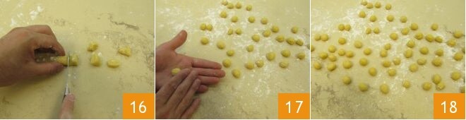 Usando uma faca, corte de cada tira nhoques de cerca de meio cm 16. Em seguida, usando a palma da mão, role os pedaços de massa um de cada vez 17 para dar-lhes uma forma esférica 18, típica dos struffoli.
