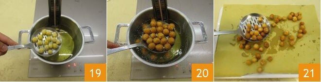 Neste ponto, você pode começar a fritar. Aqueça o óleo de sementes em uma panela para chegar à temperatura de 170° e, só quando estiver quente, com a ajuda de uma espumadeira, deixe escorregar os pedaços de massa no óleo quente 19. Para não baixar demais a temperatura do óleo, recomenda-se fritar poucos pedaços de cada vez. Vire de vez em quando seus struffoli usando uma espumadeira e, assim que estiverem bem dourados, retire-os do óleo (levará cerca de 5 minutos) 20 e transfira-os para uma bandeja forrada com papel para fritura 21.