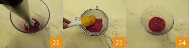 Uma vez fritos os struffoli, passe a preparar a cobertura. Primeiro, bata as framboesas usando um mixer de imersão 22; depois, passe a polpa por uma peneira 23 para obter um purê liso 24.