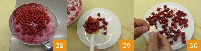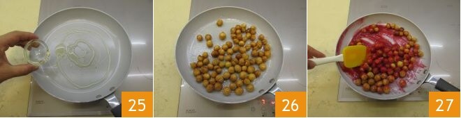 Despeje o mel em uma frigideira quente, mas não fervente 25, adicione os struffoli e misture com uma espátula até cobri-los completamente 26. Adicione o purê de framboesas recém-coado e misture para cobrir os struffoli de maneira uniforme 27.