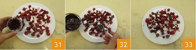 Adicione framboesas desidratadas 31, em seguida, finalize o prato com um pouco de chocolate derretido 32, framboesas frescas e sirva seus struffoli com frutas vermelhas 33!