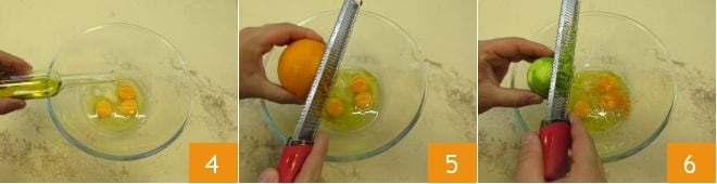 Adicione também um fio de óleo 4, uma raspada de casca de laranja (aproximadamente 1/4 será necessário) 5, e uma raspada de casca de limão 6.