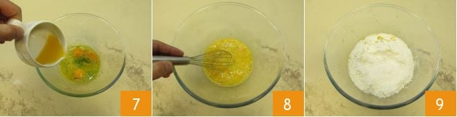 Em seguida, adicione o suco da laranja 7 e comece a misturar a massa usando um batedor 8. Despeje a farinha de uma vez dentro da mistura 9