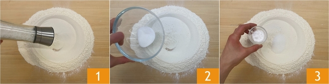 Para preparar os struffoli na fritadeira a ar, comece peneirando a farinha sobre a bancada para formar a clássica fonte, depois adicione o sal 1, o açúcar 2 e o bicarbonato 3.