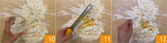 Aromatize agora com o licor de anis 10, a casca de limão 11 e a de laranja, ambas raladas. Comece a trabalhar a massa com as mãos ou com a ajuda de uma espátula 12.